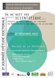 DELAPORTE Chloé, « Enjeux théoriques et politiques de la transdisciplinarité : faire une thèse en sociologie du cinéma », 2ème journée d’étude doctorale du pôle « Lien social et culturalisation » du Cerlis, On ne nait pas scientifique…, Paris, 17 décembre 2012