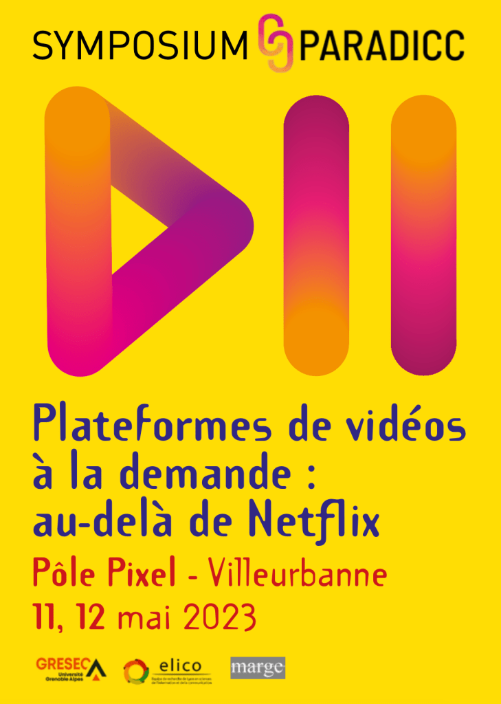 DELAPORTE Chloé, « Entre recommandation experte et captation de prestige : l’éditorialisation des contenus primés sur les plateformes de vidéo à la demande », symposium de clôture du programme PARADICC (plateformes en Auvergne Rhône-Alpes de diffusion de contenus culturels) porté par le GRESEC (Université Grenoble-Alpes), ELICO (Université Lyon 2) et MARGE (Université Lyon 3) Au delà de Netflix, Villeurbanne (France), 11-12 mai 2023